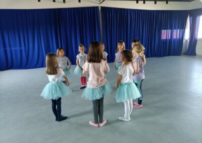 Na zajęciach dzieci tańczą głównie do muzyki klasycznej i filmowej. Swoje pierwsze baletowe układy i ćwiczenia poznają i doskonalą w radosnej atmosferze podczas zabaw tanecznych dostosowanych do ich wieku.